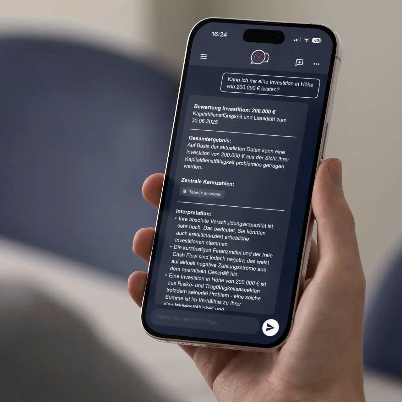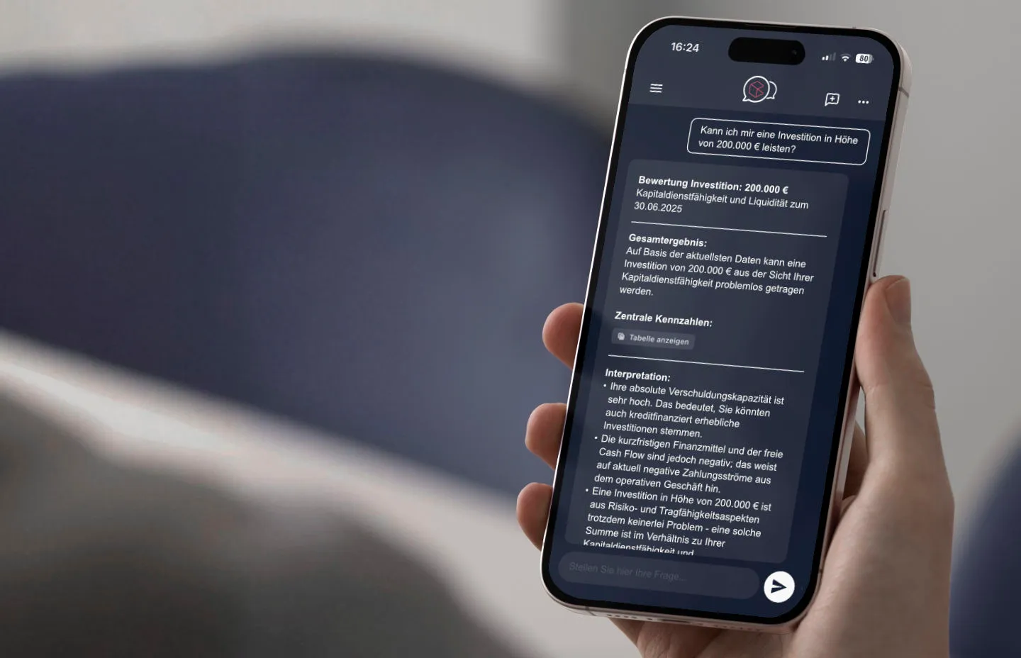 Kann ich mir eine Investition in Höhe von 200.000 € leisten? Mit CANEI.luna erhalten Sie die Antwort in Sekunden ohne Rechenstress. Klare Zahlen, verständliche Erklärungen und Handlungsempfehlungen. So haben Sie volle Kontrolle über Cash und Profit – ohne mühsame Vorbereitung.