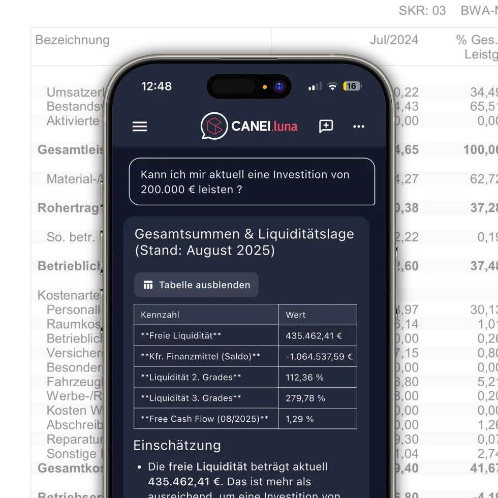 CANEI.luna entlastet Ihr Team, weil Standardfragen nicht mehr über Telefon und E-Mail laufen, und stärkt Mandanten, weil sie Kosten, Rentabilität und Abweichungen schneller verstehen und steuern.