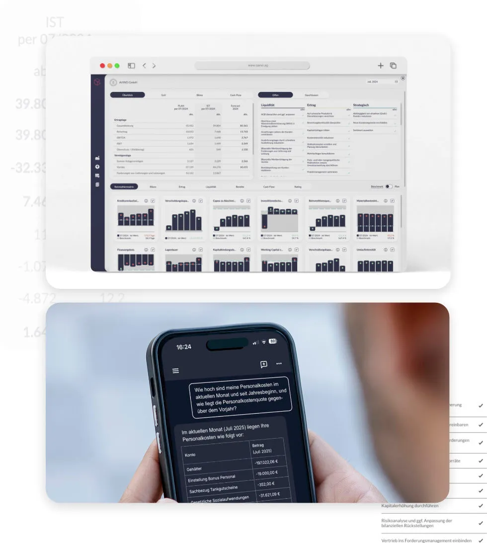 Sie reduzieren Routinearbeit im Tagesgeschäft, skalieren Planungs- und Analyseleistungen auf mehr Mandanten und behalten dabei Kontrolle, Nachvollziehbarkeit und Datenschutz durch einen geschlossenen Datenraum mit klaren Zugriffsrechten.